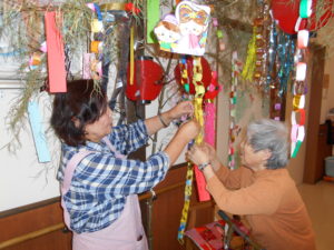 七夕には、輪飾りやちょうちんで飾った笹に、願い事を書いた短冊を吊るしました。