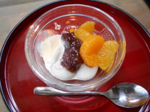 みかんと小豆を添えて、すっきりと甘く仕上がりました。(*´u`*)