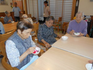 8月の行事 2019年8月26日 最終更新日時 : 2023年1月5日 admin_dvision 職員の子供たちがかき氷パーティをしてくれました。 かき氷を作って、配膳していく子供の姿に利用者の皆さんは大変喜んでおられました。 「ちべたくて美味しいちゃ(#^^#)」 利用者の皆さんは、将棋を指すなど普段から楽しく過ごしておられました。