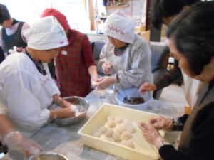 里芋を混ぜたお餅を皆でころころと丸め、きな粉、ゴマ、餡子、餡子入りの4種類を作りました。