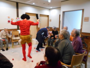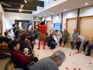 新聞紙で作った紅白のカラーボールを「鬼はー外!福はー内!」と投げて、悪い鬼を追い払いました。