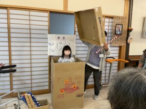 1月13日のお楽しみ会では「新春手品ショー」を行い、職員が手作りの道具を使った手品を披露しました。